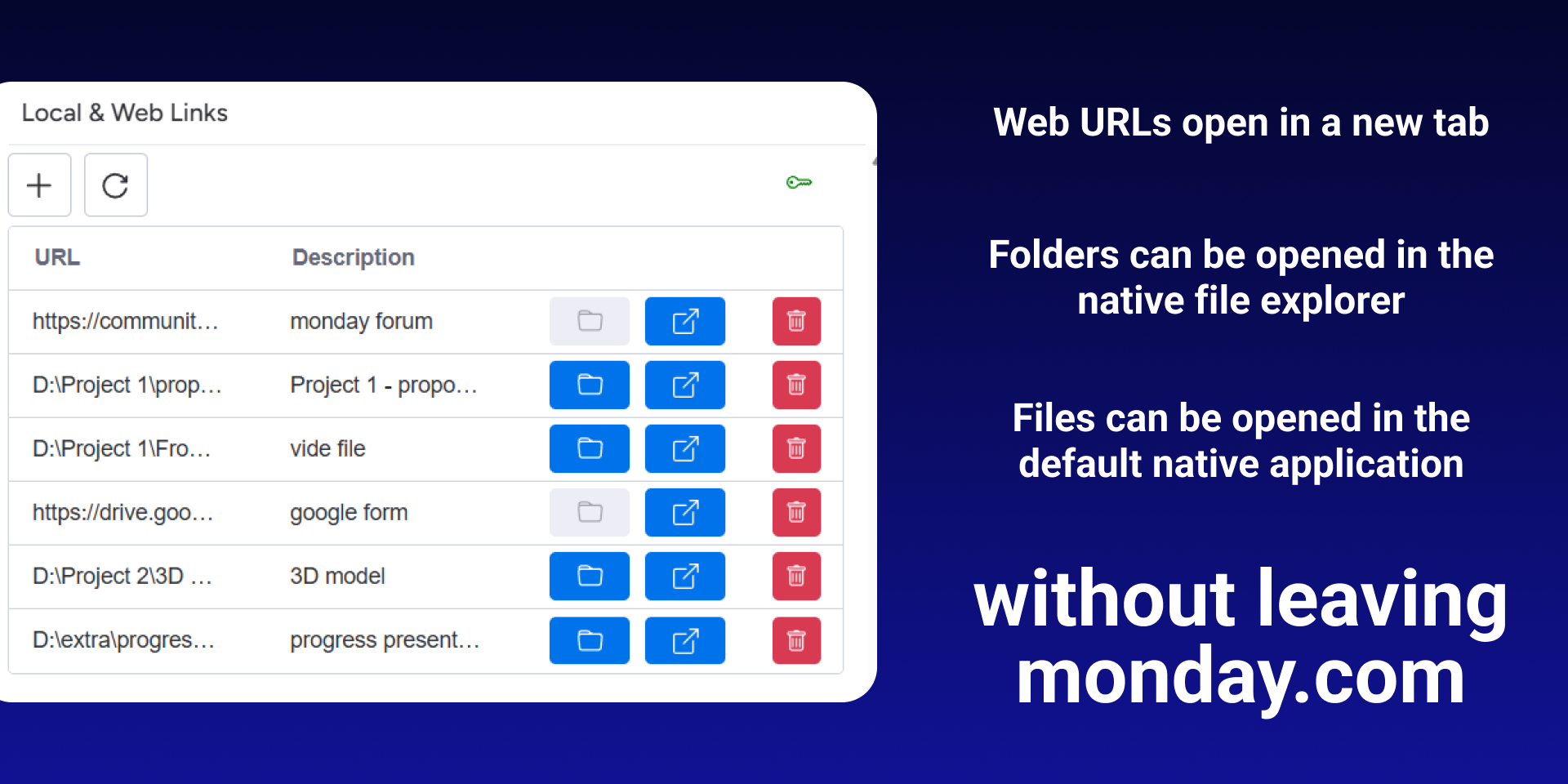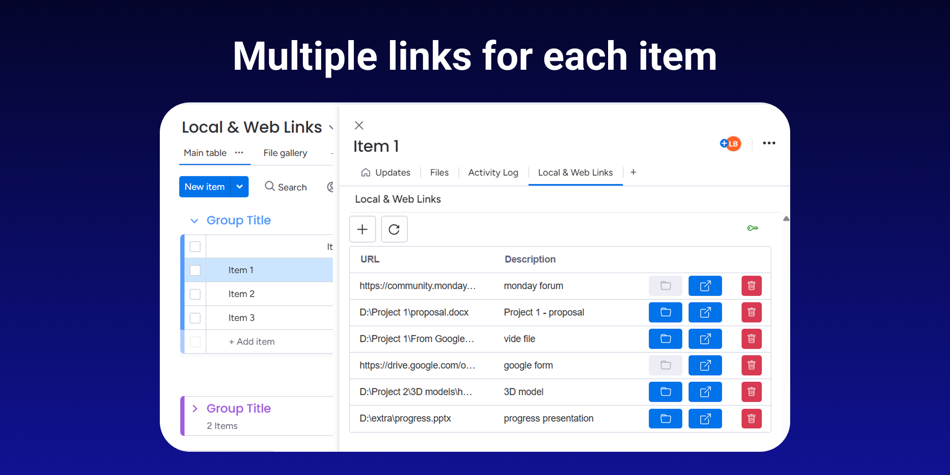 Local and Web Links is a monday.com app that lets you add multiple links to a single item. You can add local file or folder links and open them directly within monday.com by using an optional desktop companion app.